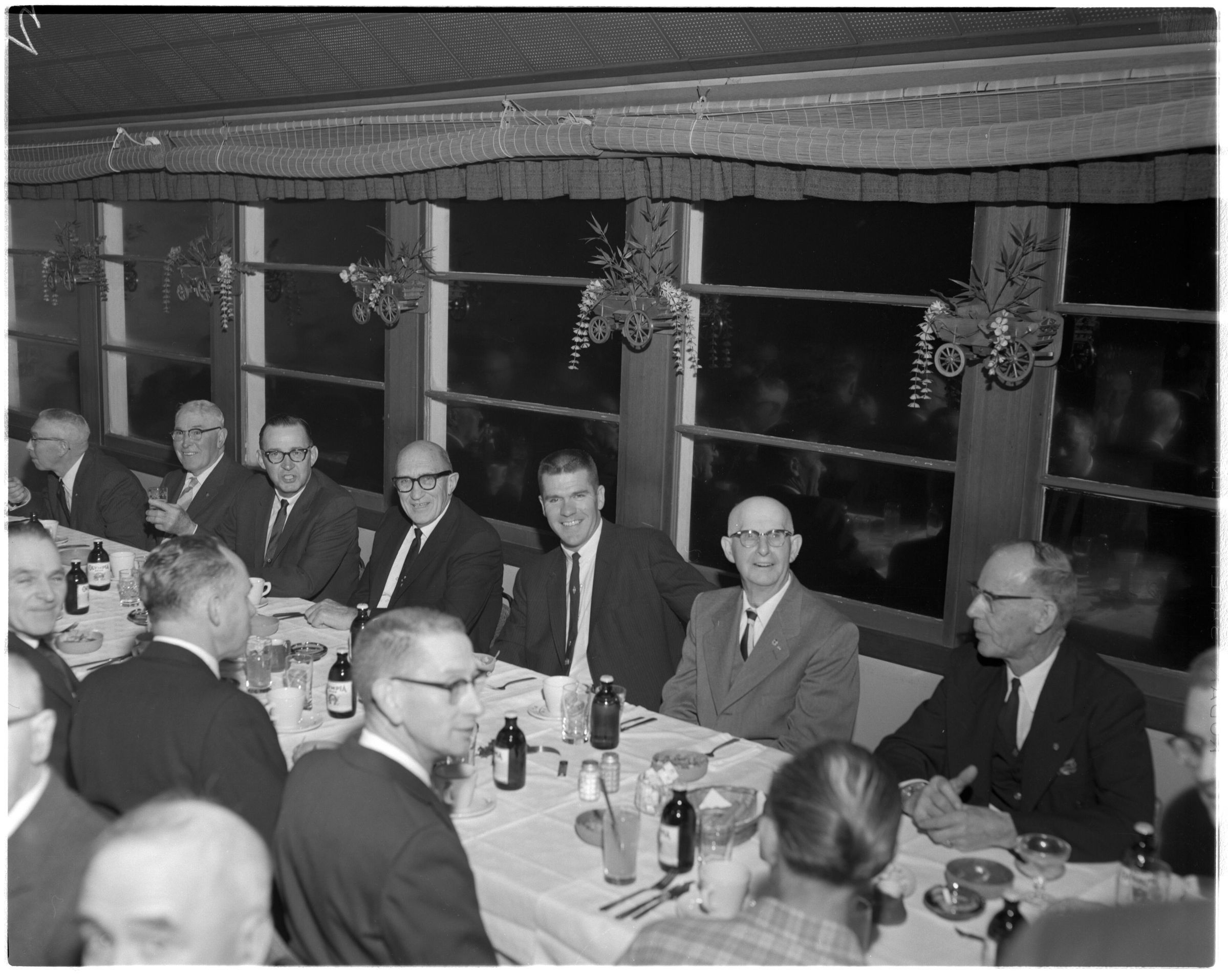 Negative, sheet film. 4 x 5 b&w. No. 4559. Olympia Brewing Company old timers banquet. Retouched 12/08/1963. Bobby Schmidt 3rd from left. No ID on others.