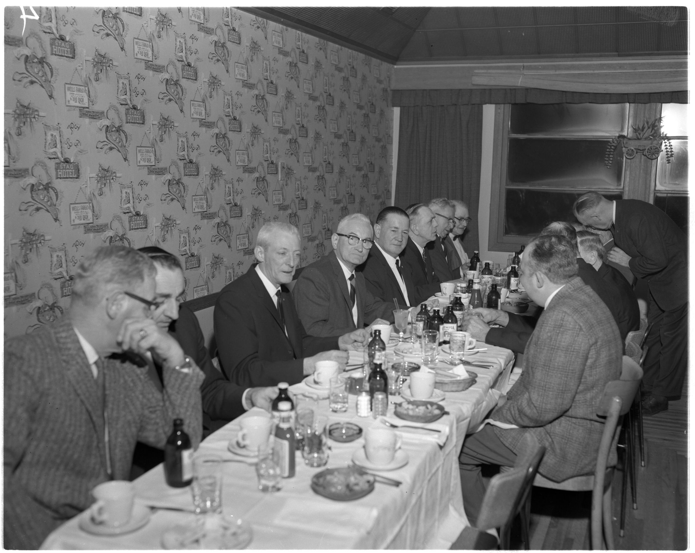 Negative, sheet film. 4 x 5 b&w. No. 4559. Olympia Brewing Company old timers banquet. Retouched 12/08/1963. Bink Schmidt 2nd from left. No ID on others.