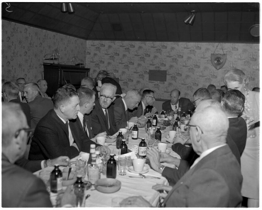 Negative, sheet film. 4 x 5 b&w. No. 4559. Olympia Brewing Company old timers banquet. Retouched 12/08/1963. No ID on people.