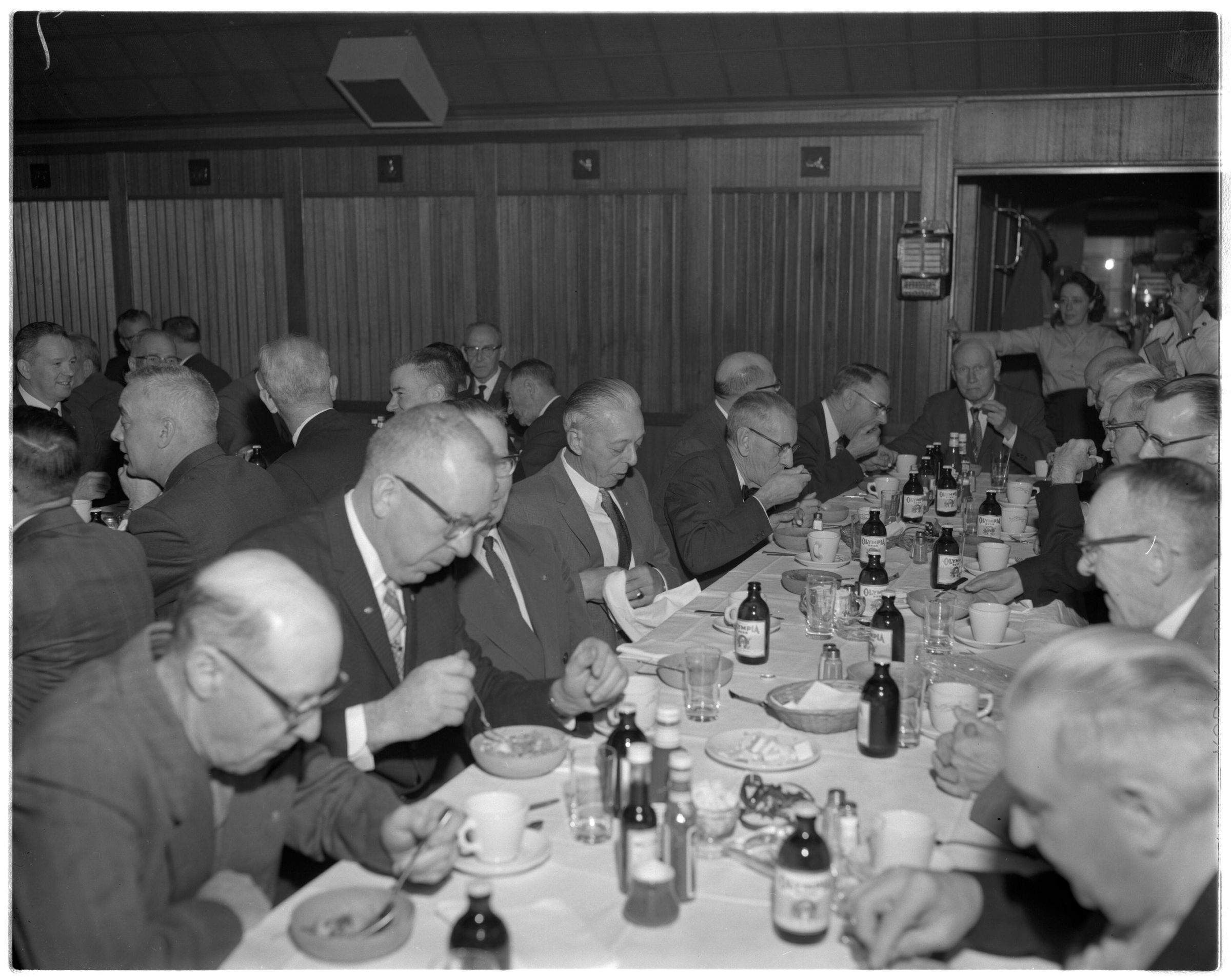 Negative, sheet film. 4 x 5 b&w. No. 4559. Olympia Brewing Company old timers banquet. Retouched 12/08/1963. No ID on people.