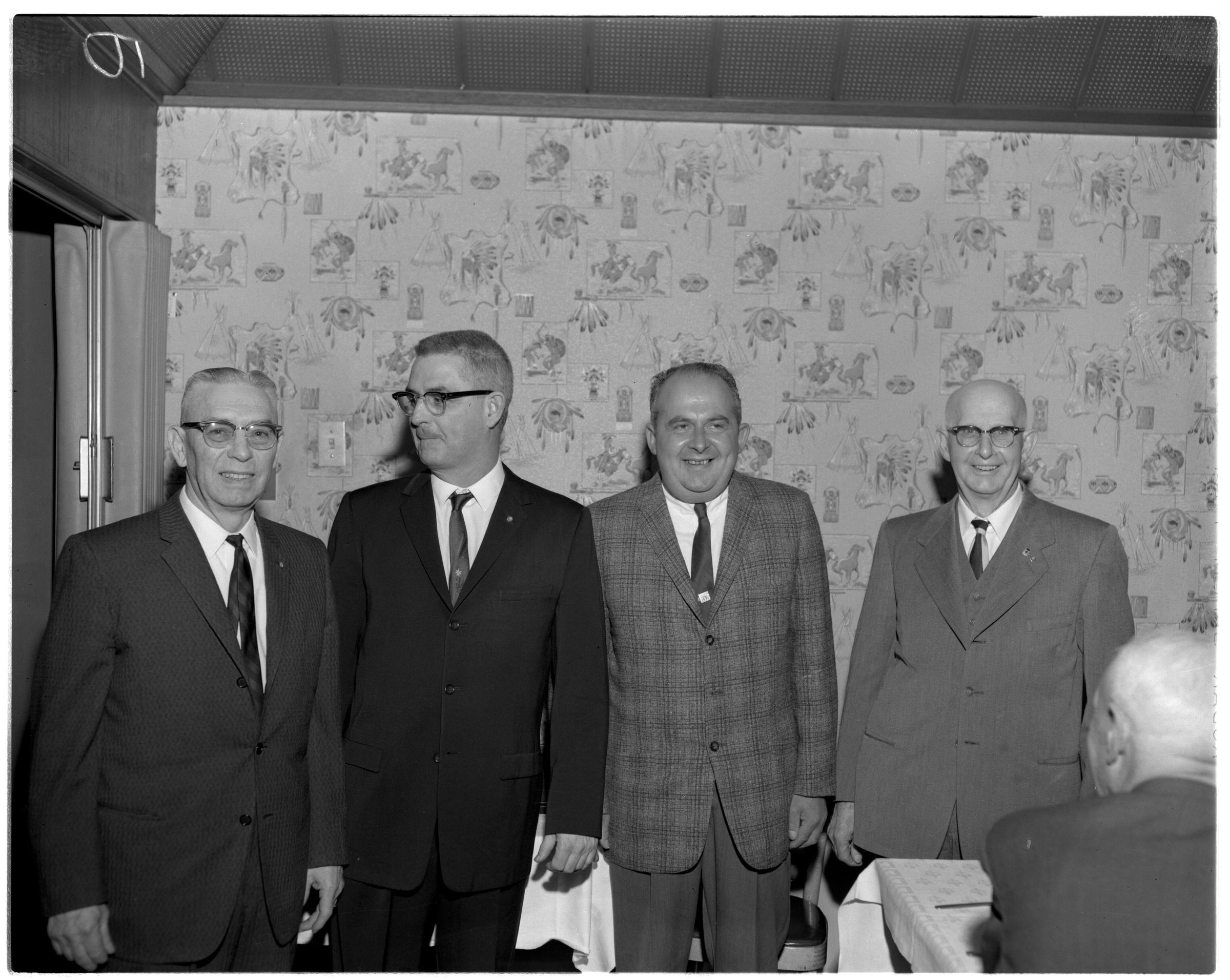 Negative, sheet film. 4 x 5 b&w. No. 4559. Olympia Brewing Company old timers banquet. Retouched 12/08/1963. No ID on people.