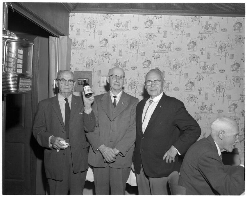 Negative, sheet film. 4 x 5 b&w. No. 4559. Olympia Brewing Company old timers banquet. Retouched 12/08/1963. No ID on people.