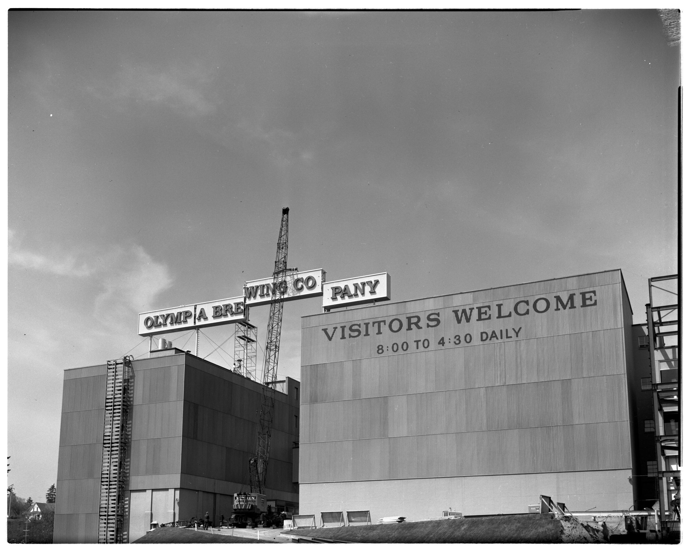Negative, sheet film. 4 x 5 b&w. No. 6716. Heath Co. Olympia brewery sign being installed on top of M cellar.