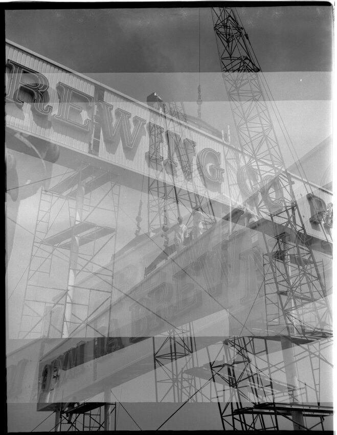 Negative, sheet film. 2.8 x 2.2 b&w. No. 6716. Olympia brewery sign being installed on top of M cellar.