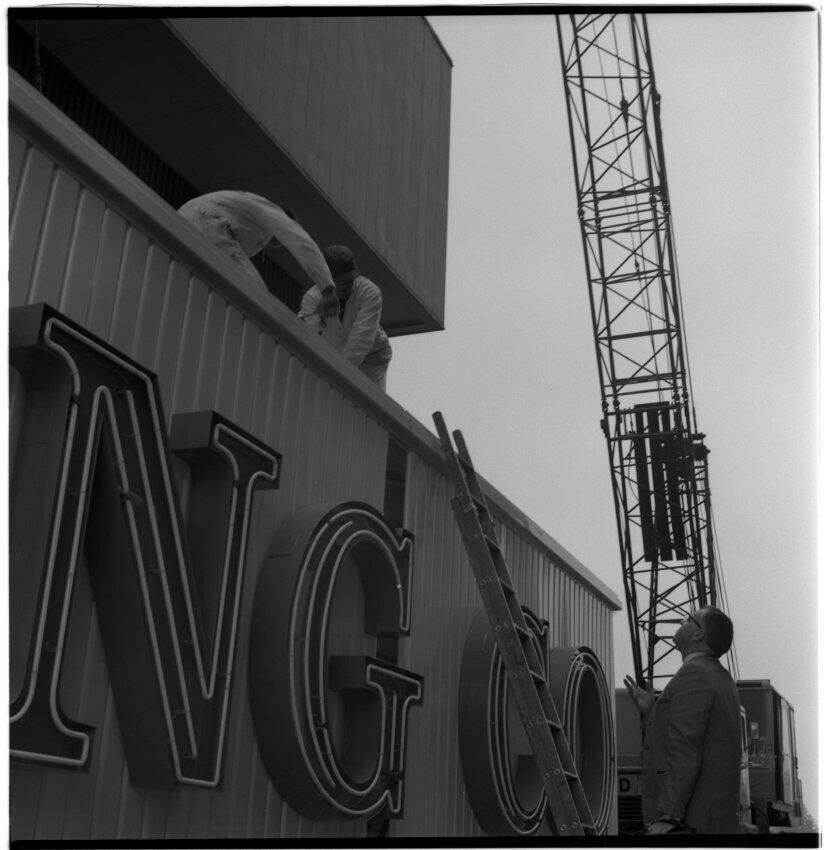Negative, sheet film. 2.25 x 2.25 b&w. No. 6716. Walt Ovens. Olympia brewery sign being installed on top of M cellar.