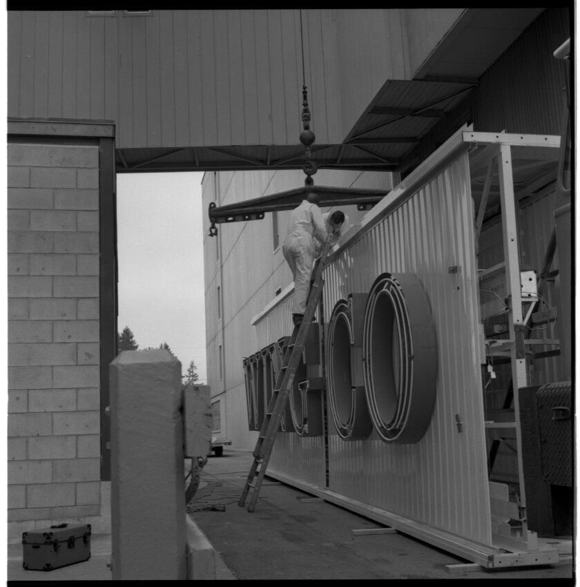 Negative, sheet film. 2.25 x 2.25 b&w. No. 6716. Walt Ovens. Olympia brewery sign being installed on top of M cellar.