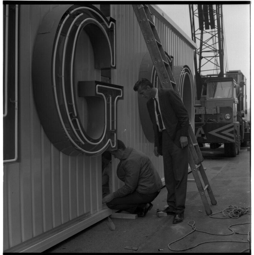 Negative, sheet film. 2.25 x 2.25 b&w. No. 6716. Walt Ovens. Olympia brewery sign being installed on top of M cellar.