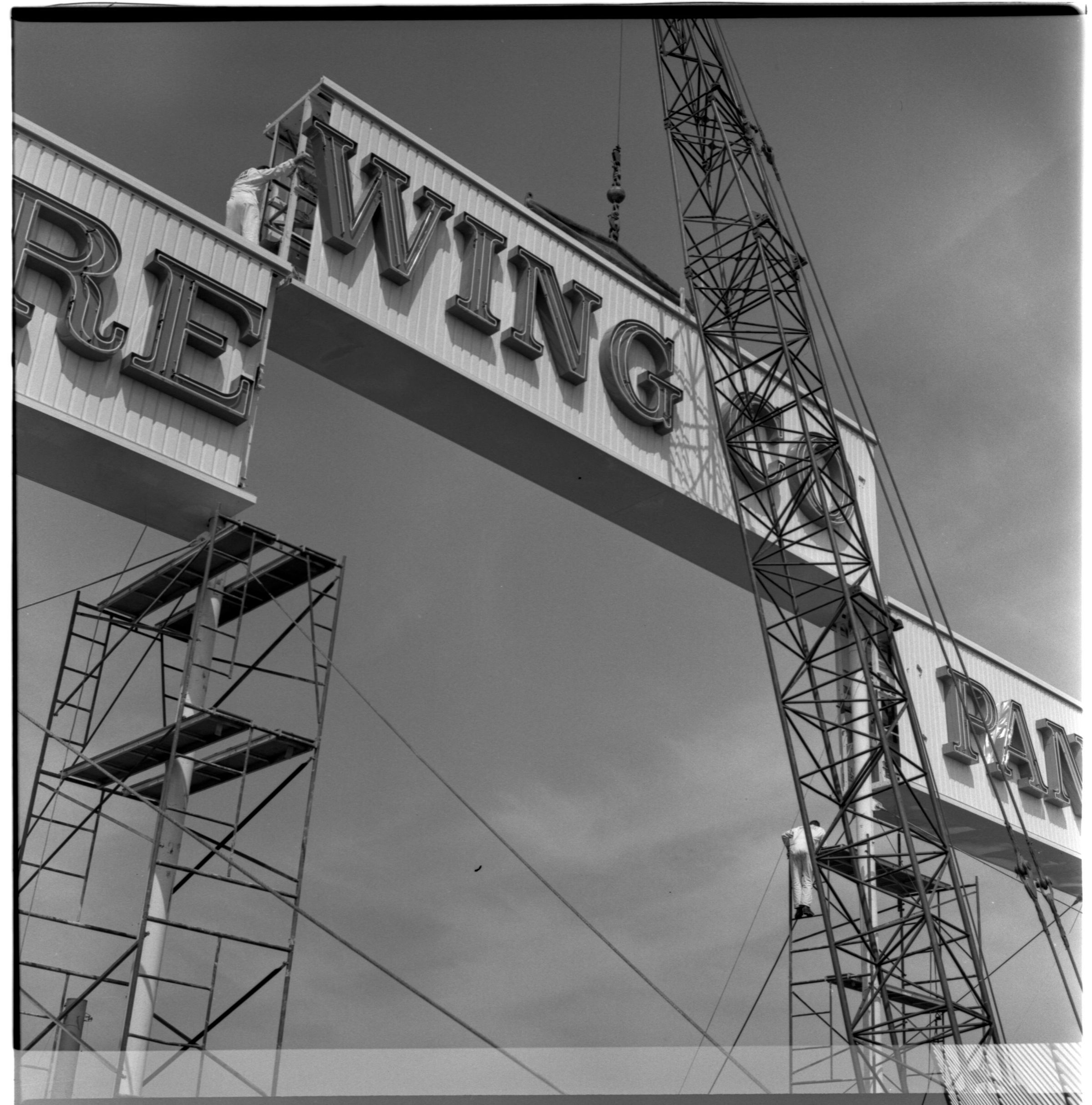 Negative, sheet film. 2.25 x 2.25 b&w. No. 6716. Walt Ovens. Olympia brewery sign being installed on top of M cellar.