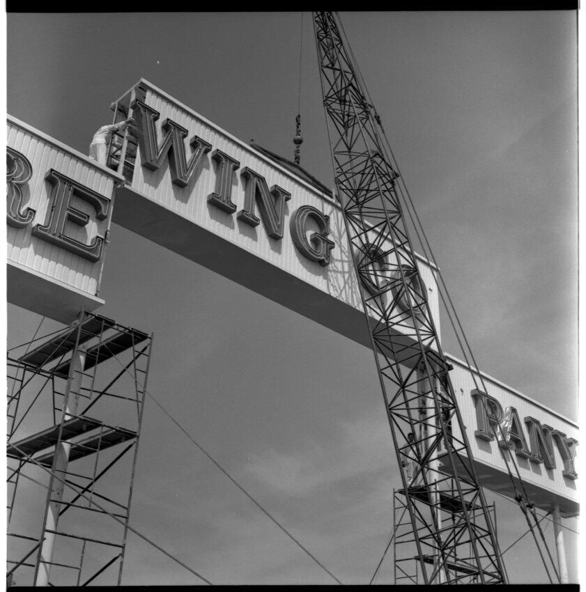 Negative, sheet film. 2.25 x 2.25 b&w. No. 6716. Walt Ovens. Olympia brewery sign being installed on top of M cellar.