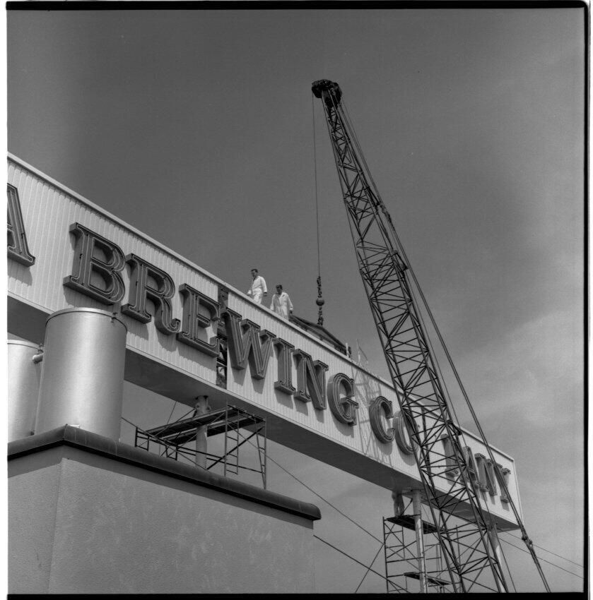 Negative, sheet film. 2.25 x 2.25 b&w. No. 6716. Walt Ovens. Olympia brewery sign being installed on top of M cellar.