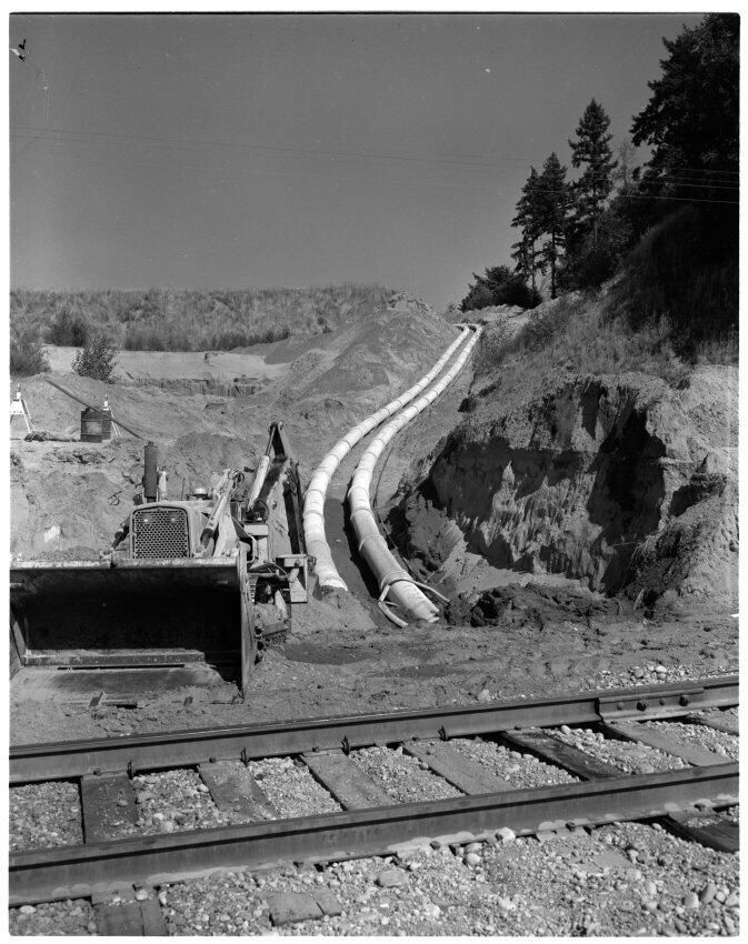 Negative, sheet film. 4 x 5 b&w. No. 6887. Certain-Teed Products Corp. (Cascade heating and plumbing, Olympia Brewery). One pipe was from well field to million-gallon storage tank; the other was for water from tank to brewery.Name/Title