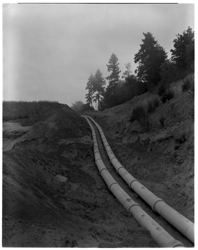 Negative, sheet film. 5 x 4 b&w. No. 6887. Certain-Teed Products Corp. (Cascade heating and plumbing, Olympia Brewery). One pipe was from well field to million-gallon storage tank; the other was for water from tank to brewery.Name/Title