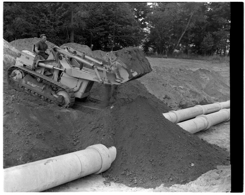 Negative, sheet film. 4 x 5 b&w. No. 6887. Certain-Teed Products Corp. (Cascade heating and plumbing, Olympia Brewery). One pipe was from well field to million-gallon storage tank; the other was for water from tank to brewery.Name/Title