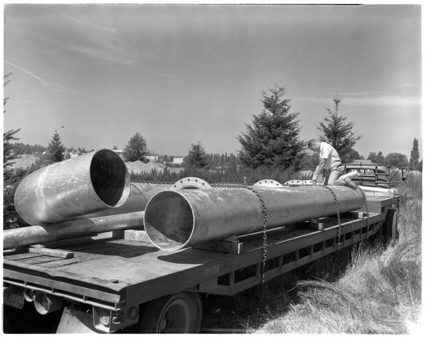 Negative, sheet film. 4 x 5 b&w. No. 6887. Certain-Teed Products Corp. (Cascade heating and plumbing, Olympia Brewery). One pipe was from well field to million-gallon storage tank; the other was for water from tank to brewery.Name/Title