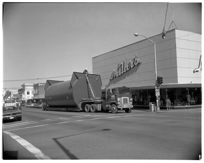 Negative, sheet film. 4 x 5 b&w. Olympia Brewing Co. tank going though Olympia. Tank may have been made at Reliable Welding in Olympia. Man on top of tank is watching for low-hanging telephone lines, etc.Name/Title
