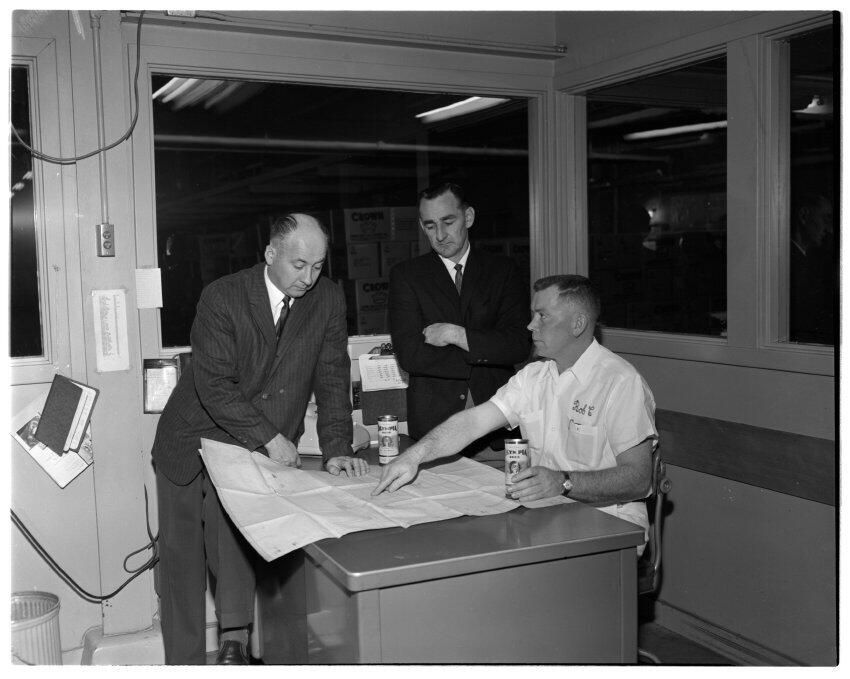 Negative, sheet film. 4 x 5 b&w. No. 3526. Olympia Brewing Co. Bink Schmidt in center. Gordon Barry on left, Bob Chase on right.