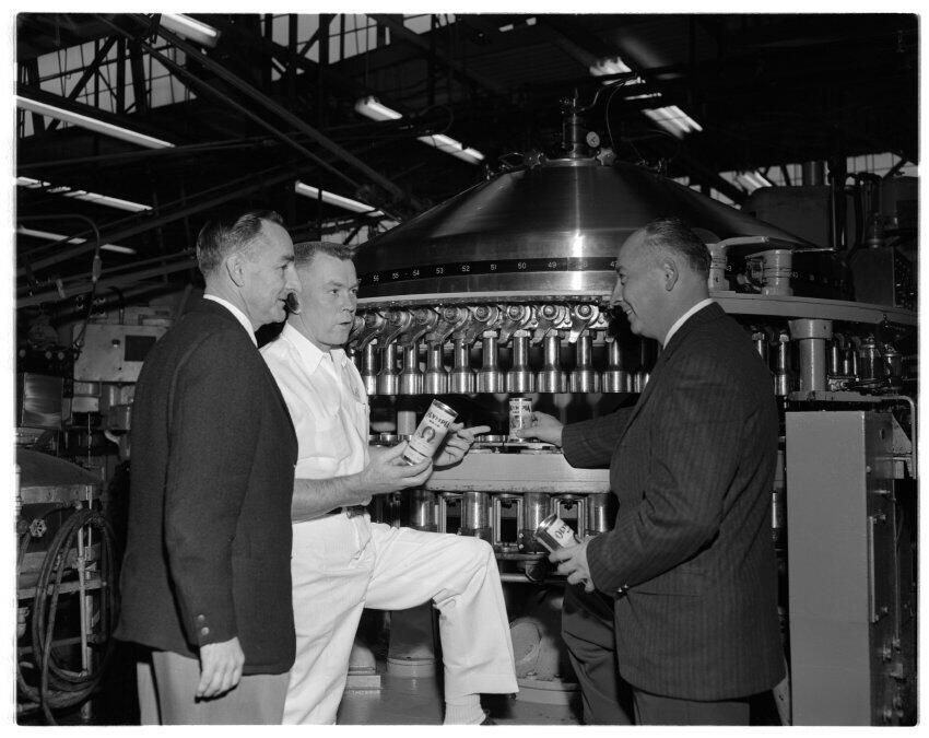 Negative, sheet film. 4 x 5 b&w. No. 3526. Olympia Brewing Co. Bink Schmidt on left. Bob Chase in center. Man on right is Gordon Barry.