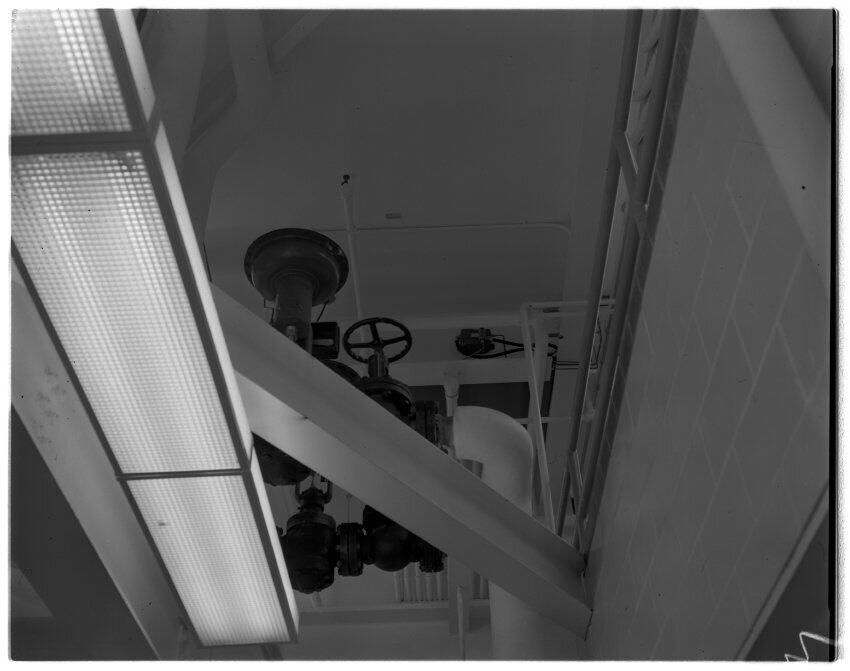 Negative, sheet film. 4 x 5 b&w. No. 3242. Olympia Brew Co. Leeds and Northrup Co. W.S. Randall Jr. 1311 Republican St. Seattle 9. Reordered 02/24/1961. View of ceiling at B brewhouse. Valves are for steam handling.Name/Title