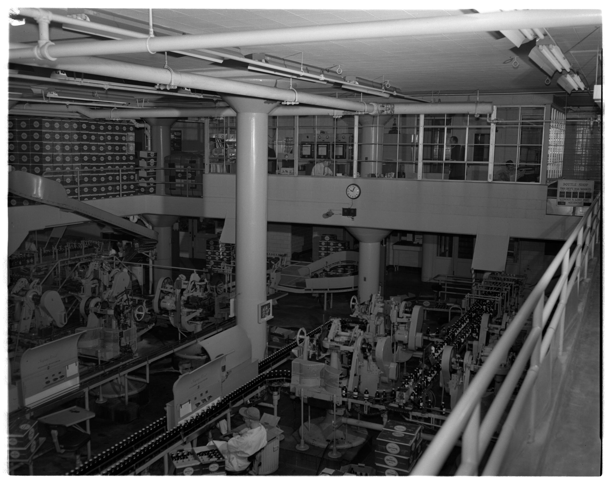 Negative, sheet film. 4 x 5 b&w. No. 3242. Olympia Brew Co. Leeds and Northrup Co. W.S. Randall Jr. 1311 Republican St. Seattle 9. Reordered 02/24/1961. A bottlehouse, viewed from catwalk above production floor.Name/Title