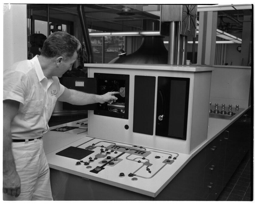Negative, sheet film. 4 x 5 b&w. No. 3242. Olympia Brew Co. Leeds and Northrup Co. W.S. Randall Jr. 1311 Republican St. Seattle 9. Reordered 02/24/1961. B brewhouse control panel. Biff Borden at controls.Name/Title