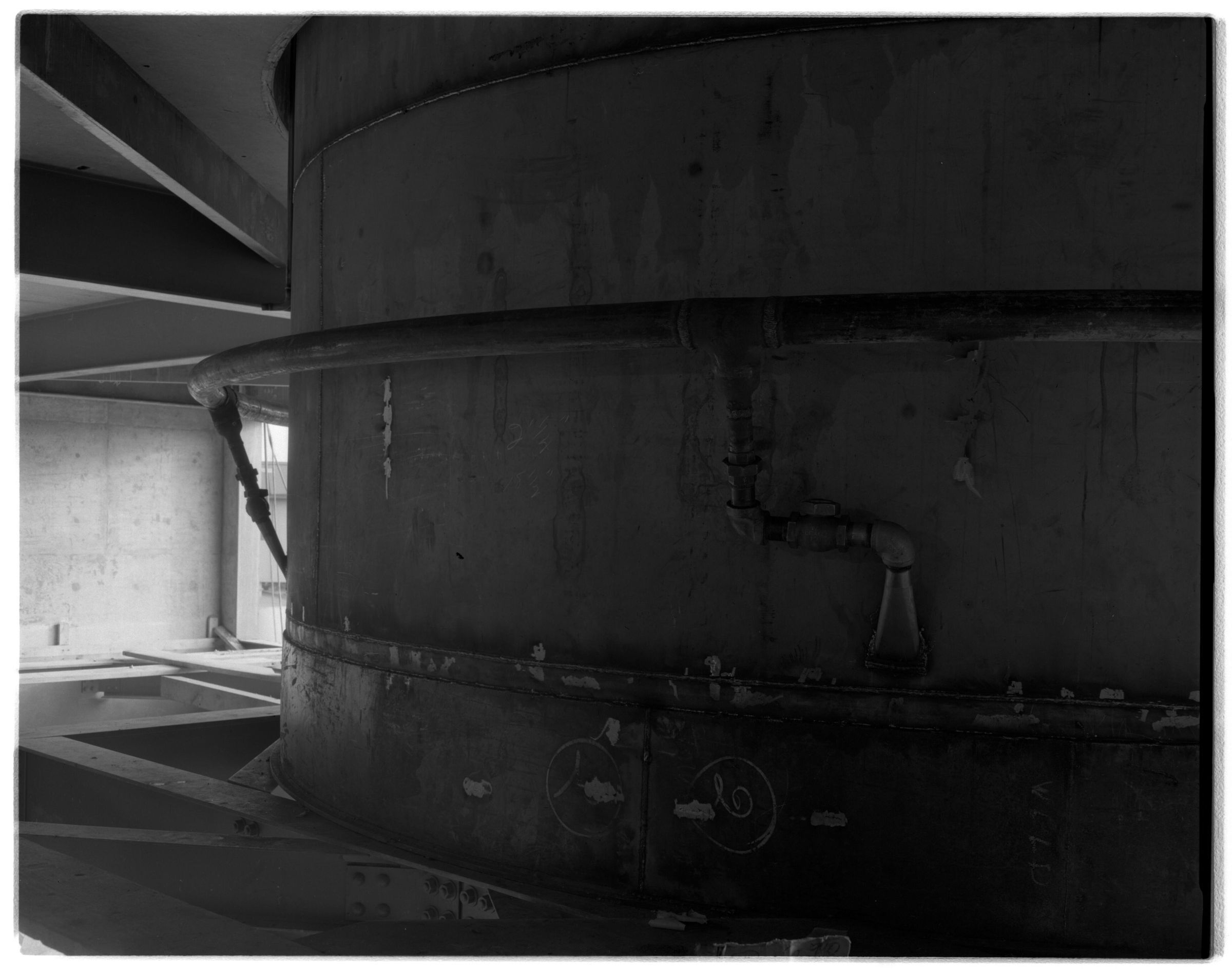Negative, sheet film. 4 x 5 b&w. No. 41. Salon (Solor?) Chicago. Oly Brew Co tanks.