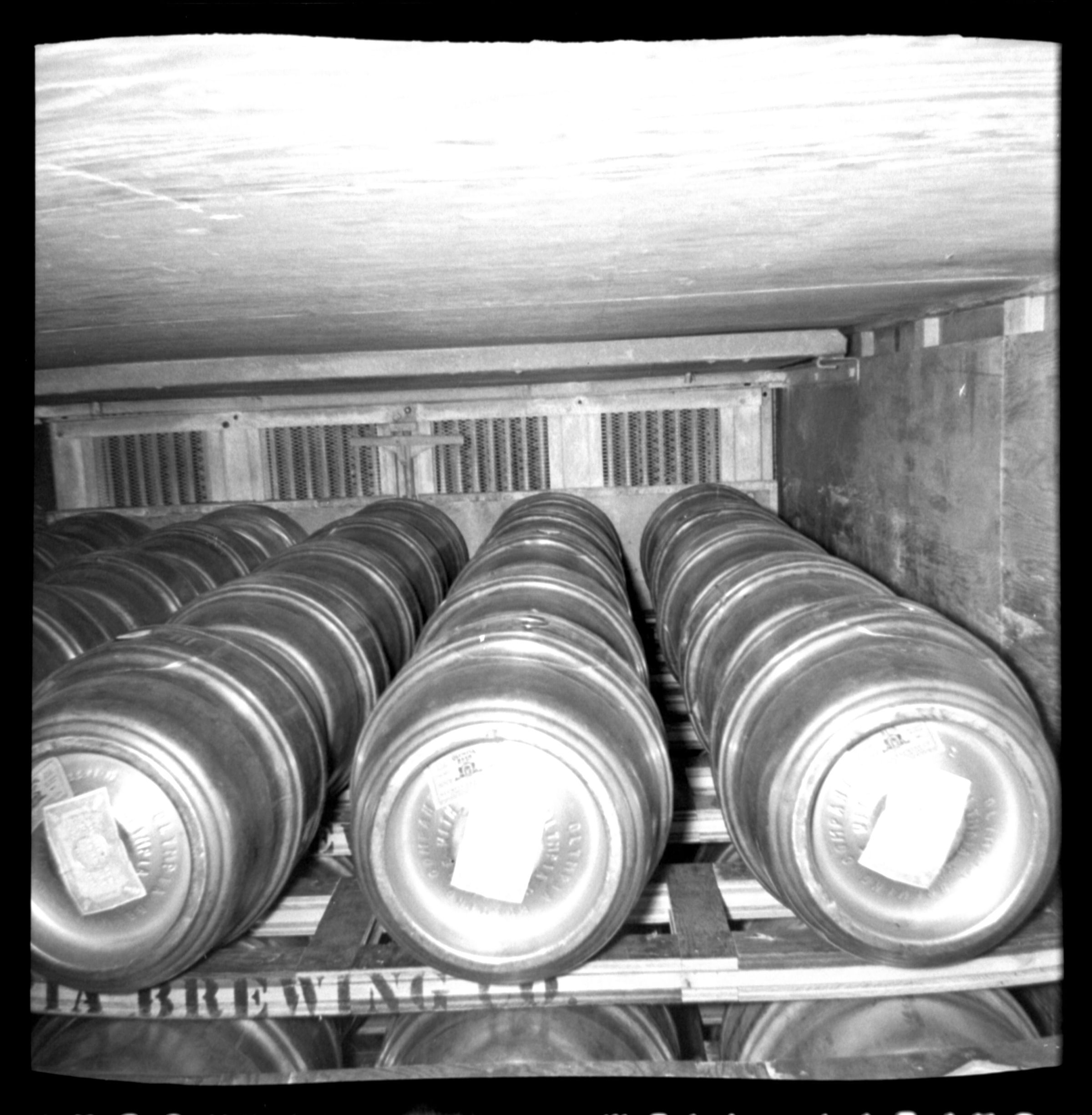 Negative, sheet film. 1.75 x 1.75 b&w. Dewey car loading. Papers pasted on top of each keg were tax stamps.
