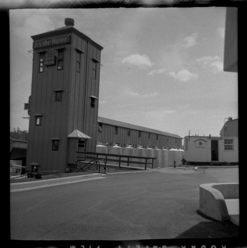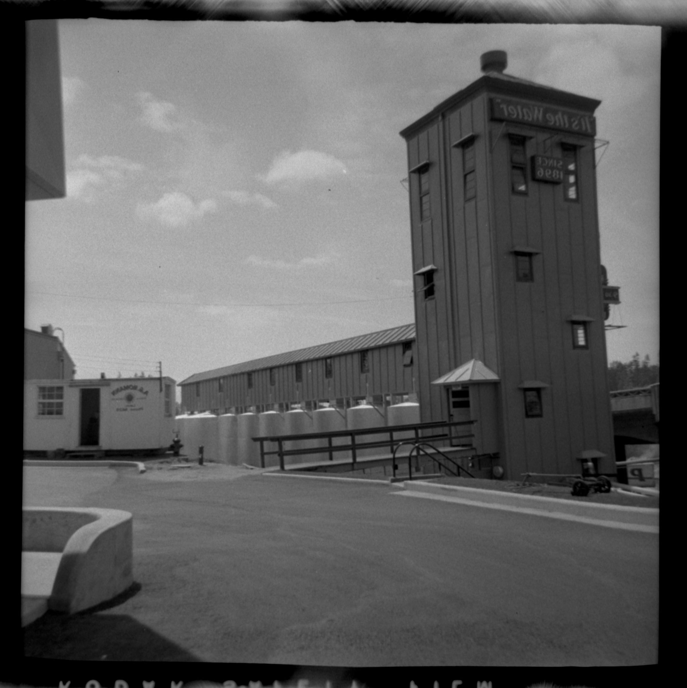 Negative, sheet film. 1.75 x 1.75 b&w. Grain handling "head house" tower and grain bins at Oly brewery. Job shack on right belongs to A. G. Homann, long-time contractor for new brewery buildings.
