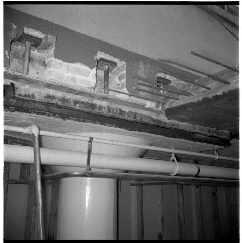 Negative, sheet film. 2.25 x 2.25 b&w. Construction/repair at Oly brewery. Possibly expansion of A bottlehouse. Support column in center.