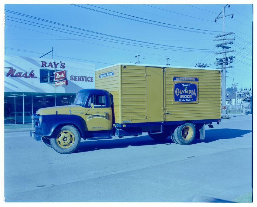 Negative, sheet film. 4 x 5 color. No. 770. Olympia Brewing Co. Truck owned by State Distributing Company. Circa 1954-55.