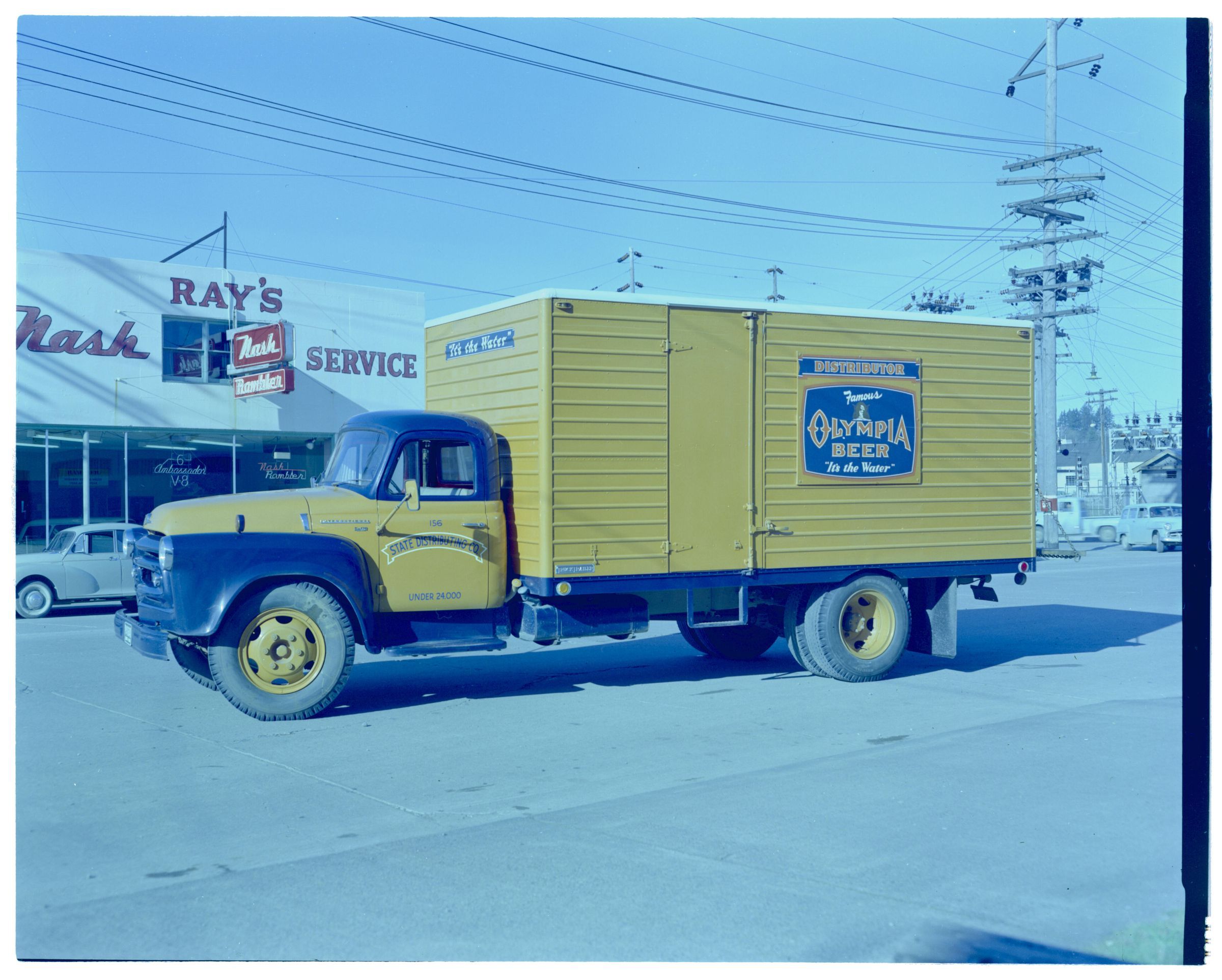 Negative, sheet film. 4 x 5 color. No. 770. Olympia Brewing Co. Truck owned by State Distributing Company. International truck, circa 1954.
