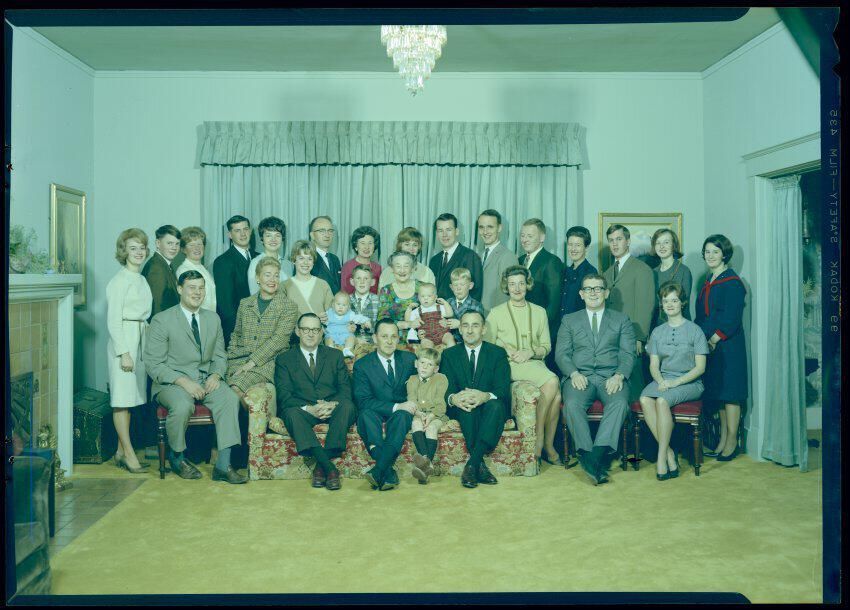 Negative, sheet film. 5 x 7 color. No. T489. Mrs Adolph Schmidt. Family in color, for Christmas, at Winifred Schmidt's house. Received 09/06/1966. Sent 11/28/1966.