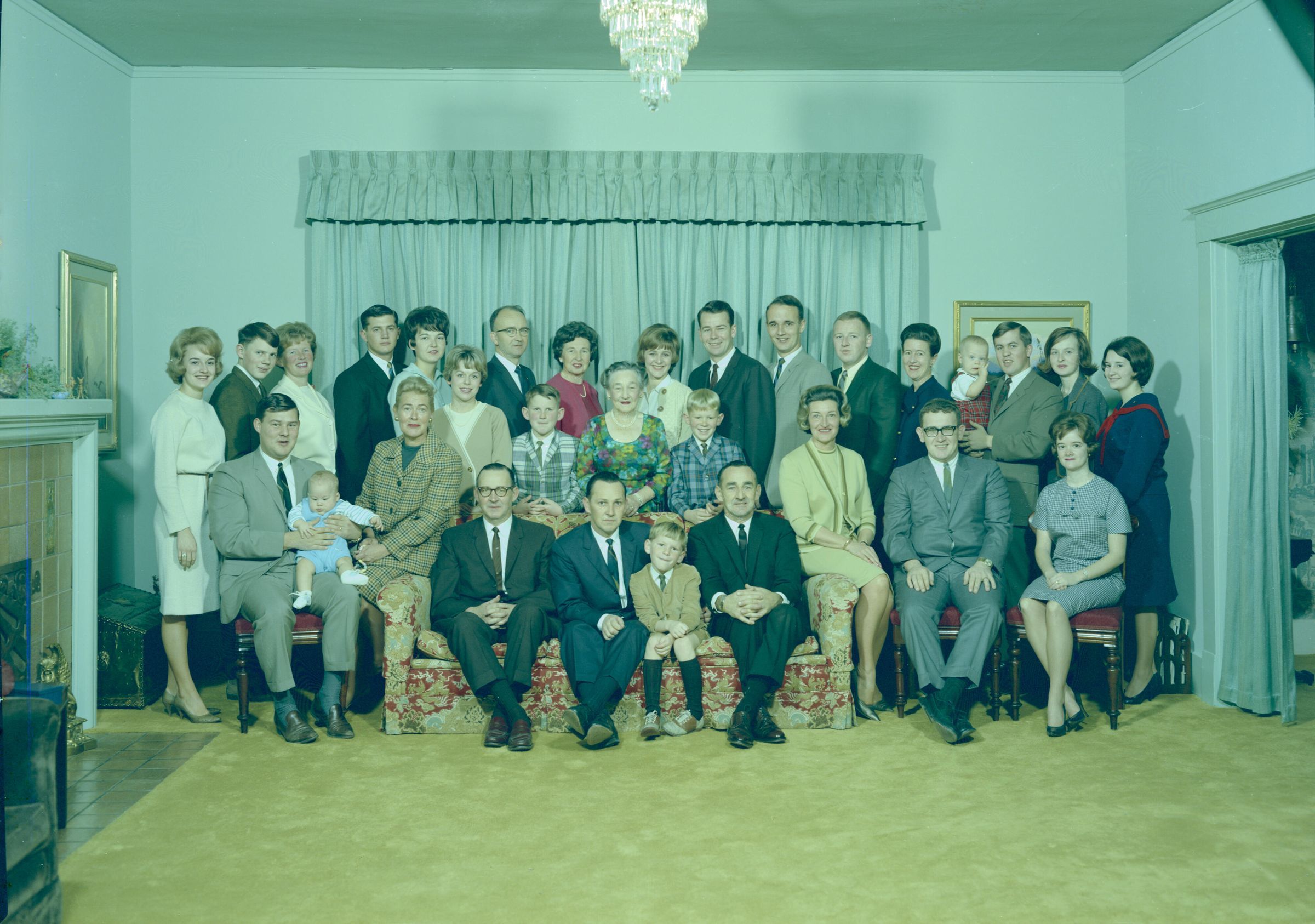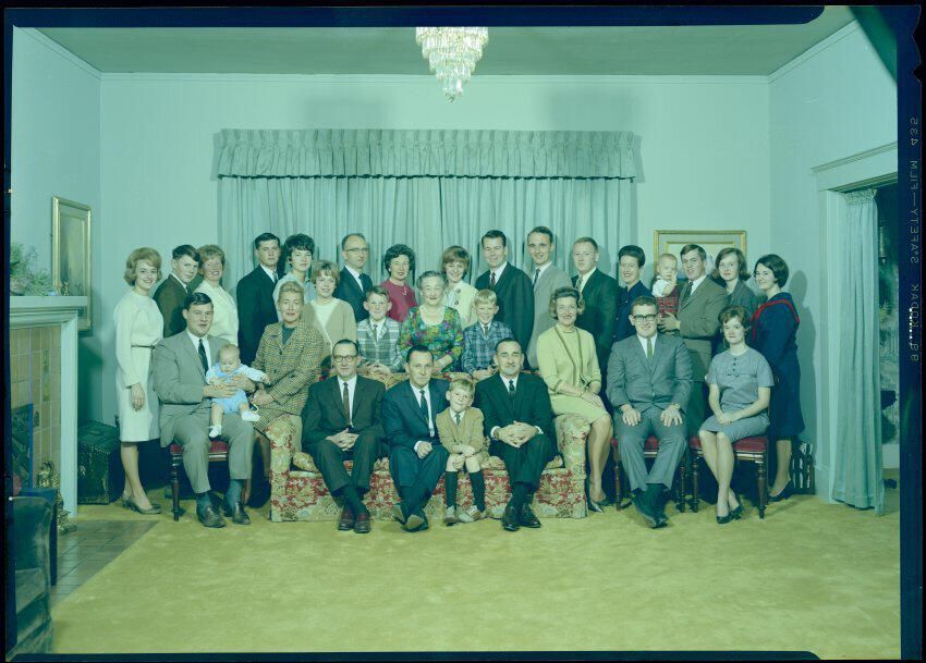 Negative, sheet film. 5 x 7 color. No. T489. Mrs Adolph Schmidt. Family in color, for Christmas, at Winifred Schmidt's house. Received 09/06/1966. Sent 11/28/1966.