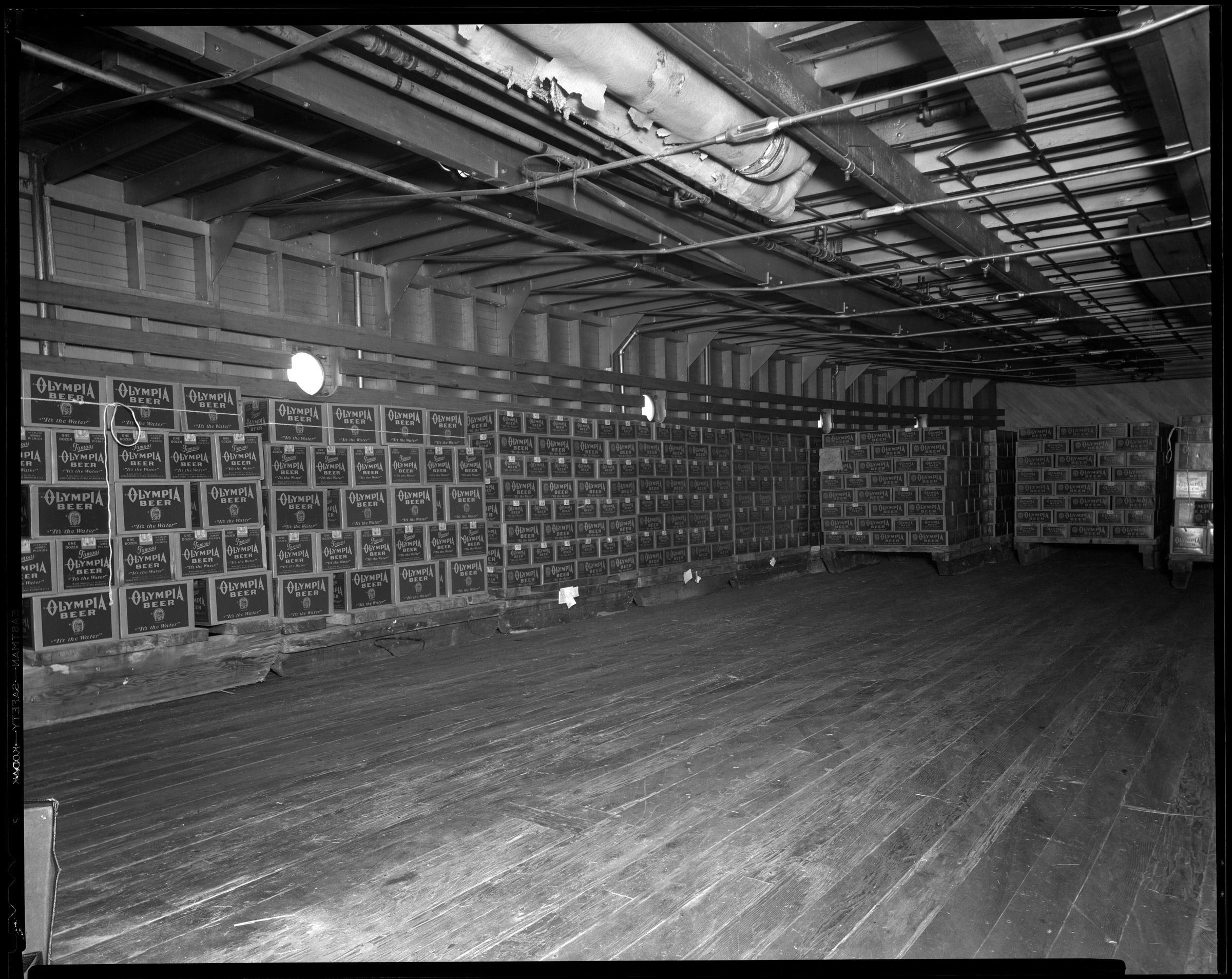 Negative, sheet film. 8 x 10 b&w. Olympia Brewing Co. Puget Sound Freight Lines warehouse at Port of Olympia.