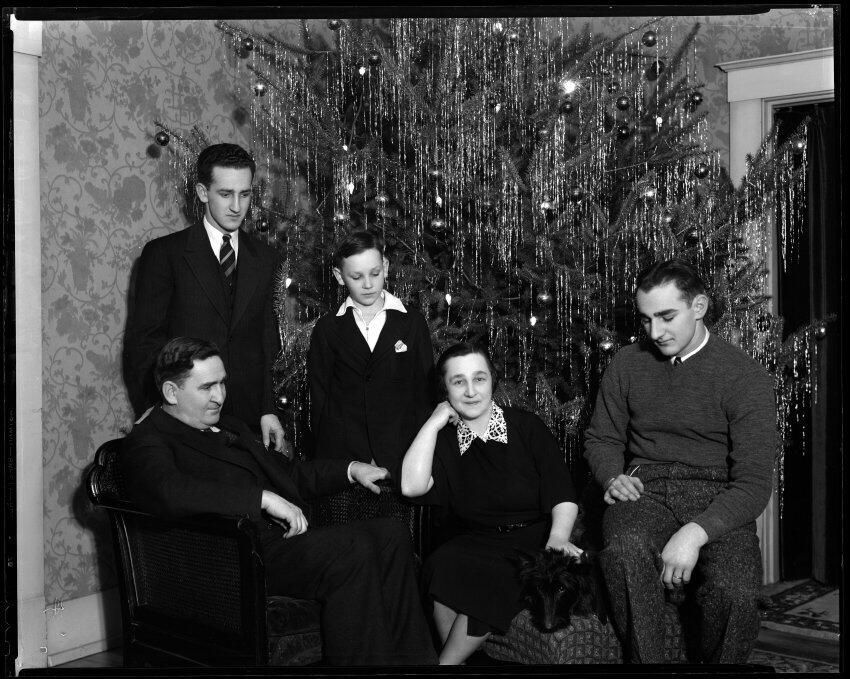 Negative, sheet film. 8 x 10 b&w. Adolph, Bump, Skip, Winifred, and Bink Schmidt. Christmas tree