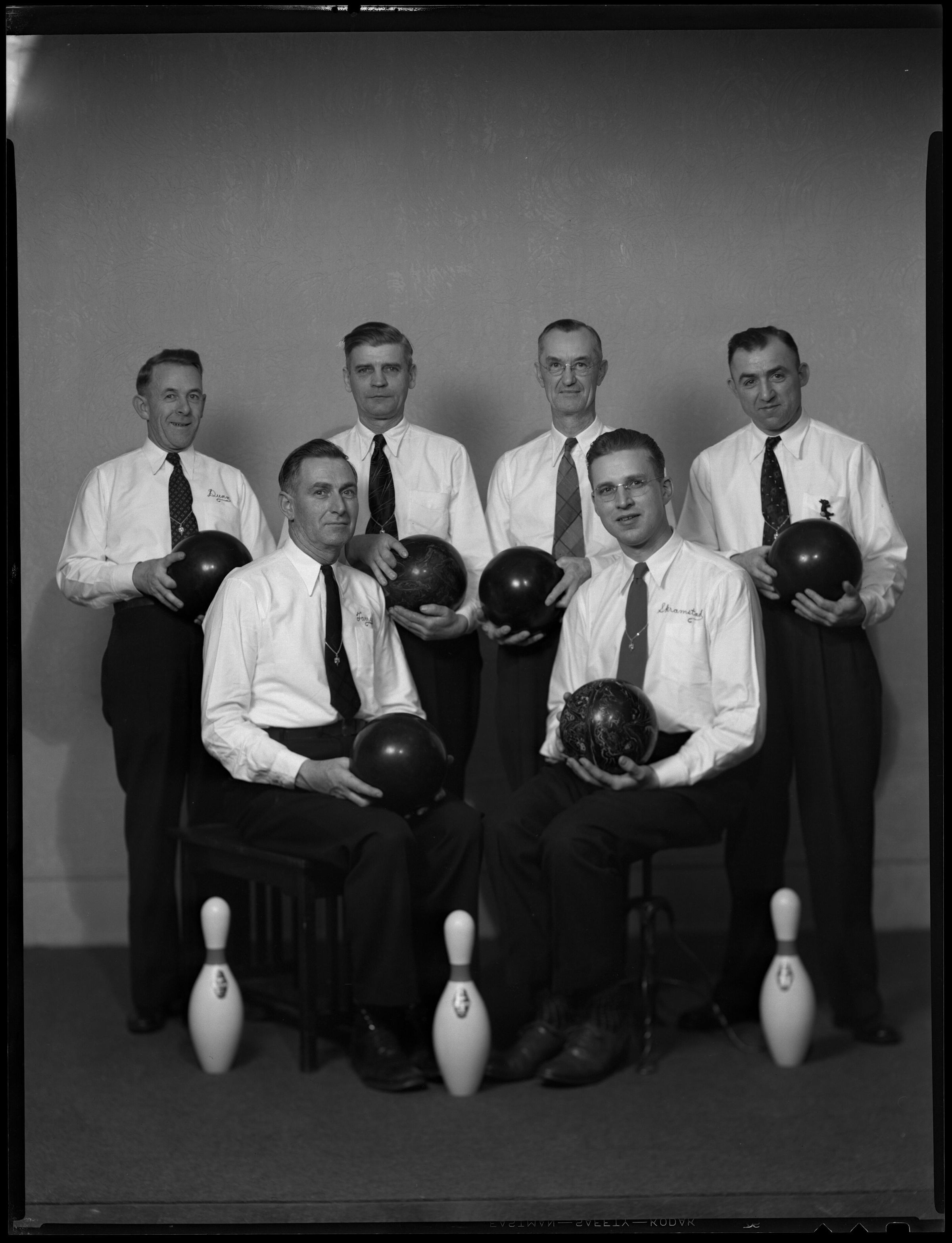 Negative, sheet film. 8.5 x 6.5 b&w. Olympia Brewing Co. bowling team. No ID on men.