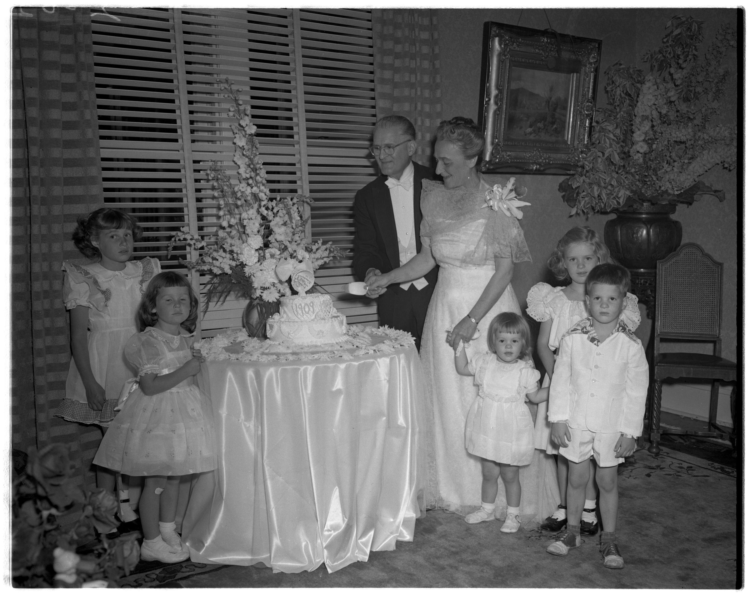 Negative, sheet film. 4 x 5 b&w. No. 2656. Celebration for Peter and Clara Schmidt's 40th wedding anniversary (1909 - 1949). No ID on children.