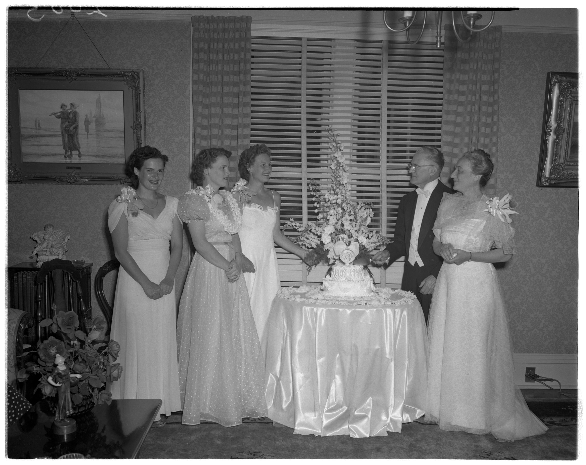 Negative, sheet film. 4 x 5 b&w. No. 2656. Celebration for Peter and Clara Schmidt's 40th wedding anniversary (1909 - 1949). Marie, Alice, Nootchie, Peter, Clara.