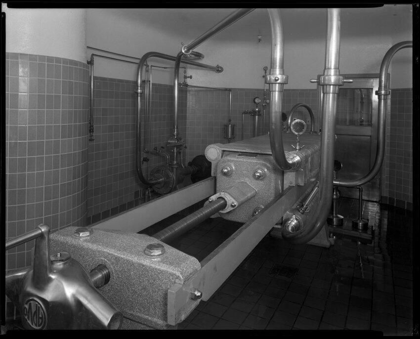 Negative, sheet film. 8 x 10 b&w. Olympia Brewing Co. beer cooling machine. Plate and frame cooler used in early days of post-Prohibition brewing. Would have cooled about 400 barrels of beer per hour.Name/Title
