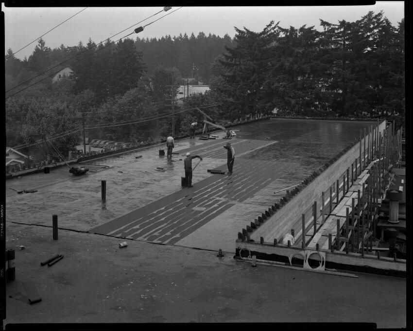 Negative, sheet film. 8 x 10 b&w. Fiberglass Corp. Roofing, working on new J cellar.