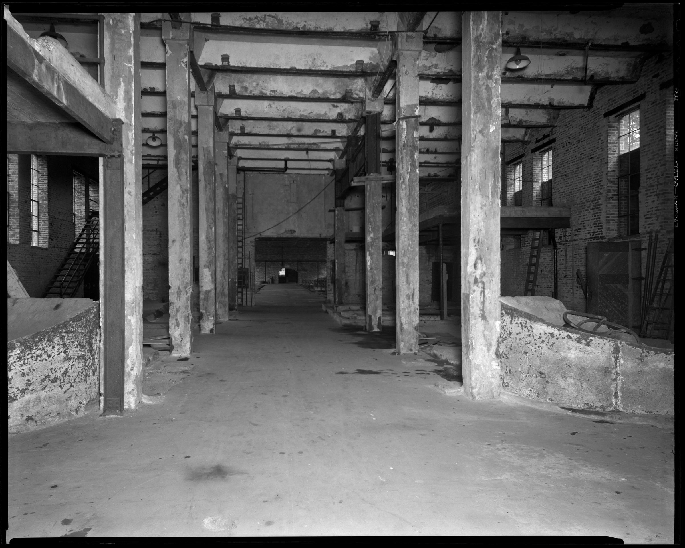 Negative, sheet film. 8 x 10 b&w. No. B474. Tumwater Paper Mill, bottom floor of long building. Old Olympia brewery was acquired by paper mill in early 1920s, and circa 1926, this long building was added to house paper-making machines. Building was abandoned in early 1930s and sat empty until 1946.Name/Title