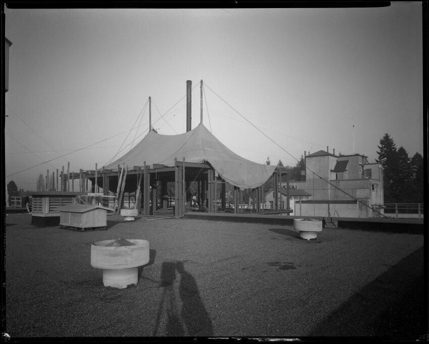 Negative, sheet film. 8 x 10 b&w. No. E442. Olympia Brewing Co. Construction work. Original 1933 brewhouse complex in background. Roof in foreground may be cellar building under construction.
