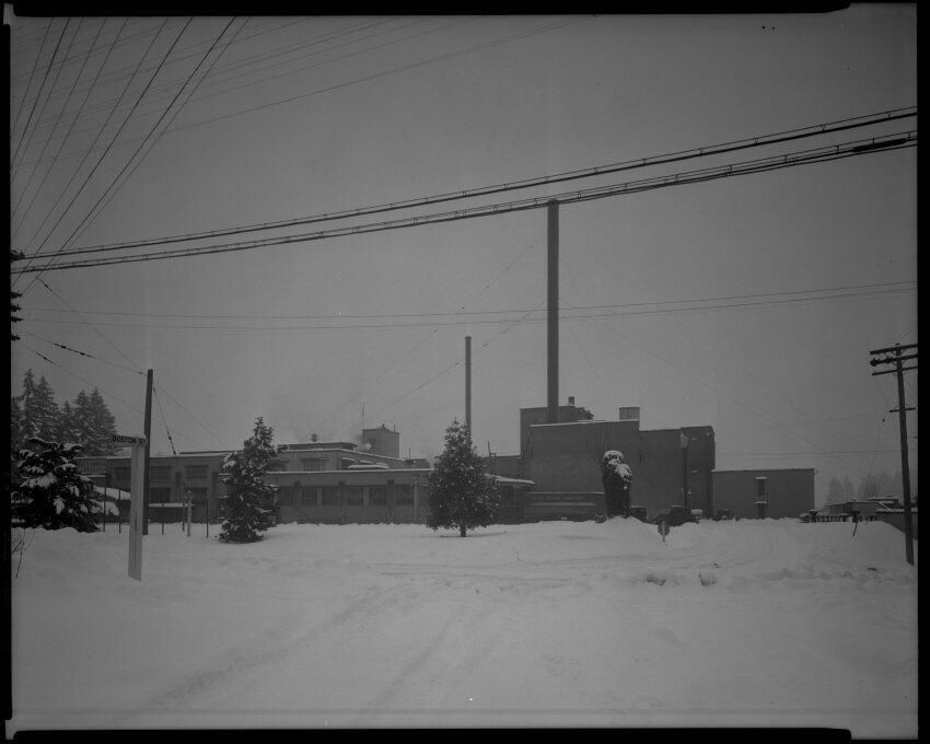 Negative, sheet film. 8 x 10 b&w. Olympia Brewing Co. in snow.