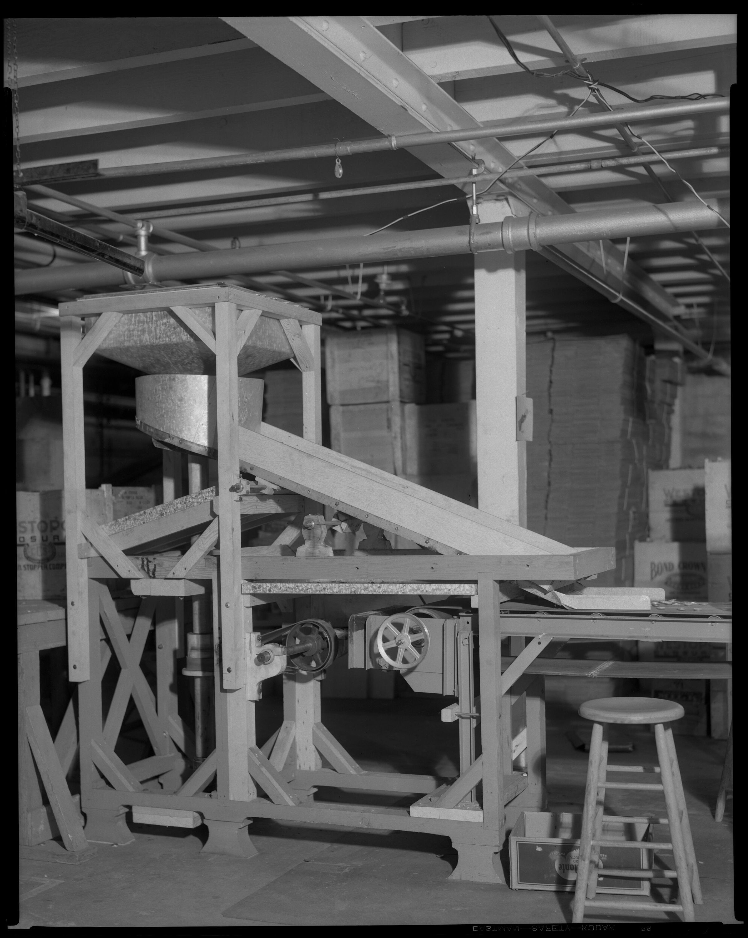 Negative, sheet film. 10 x 8 b&w. Sorting and recrimping bottle caps/crowns at Olympia Brewery.
