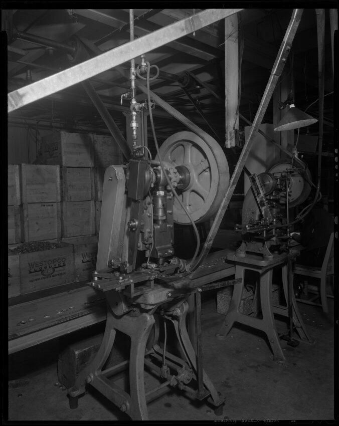 Negative, sheet film. 10 x 8 b&w. Sorting and recrimping bottle caps/crowns at Olympia Brewery.