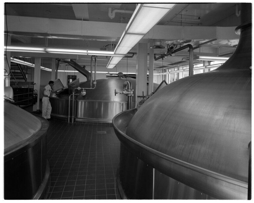 Negative, sheet film. 4 x 5 b&w. P.S.(?) Jr. Industries, Inc. By Mr. G. Dexter. Brewing kettle in B brewhouse at Oly brewery. Ole Hanson in background.