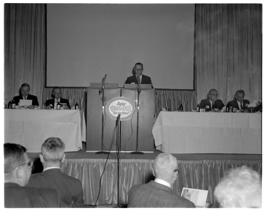 Negative, sheet film. 4 x 5 b&w. Olympia Brewing Co. stockholders meeting. Bobby Schmidt at podium. No ID on others.