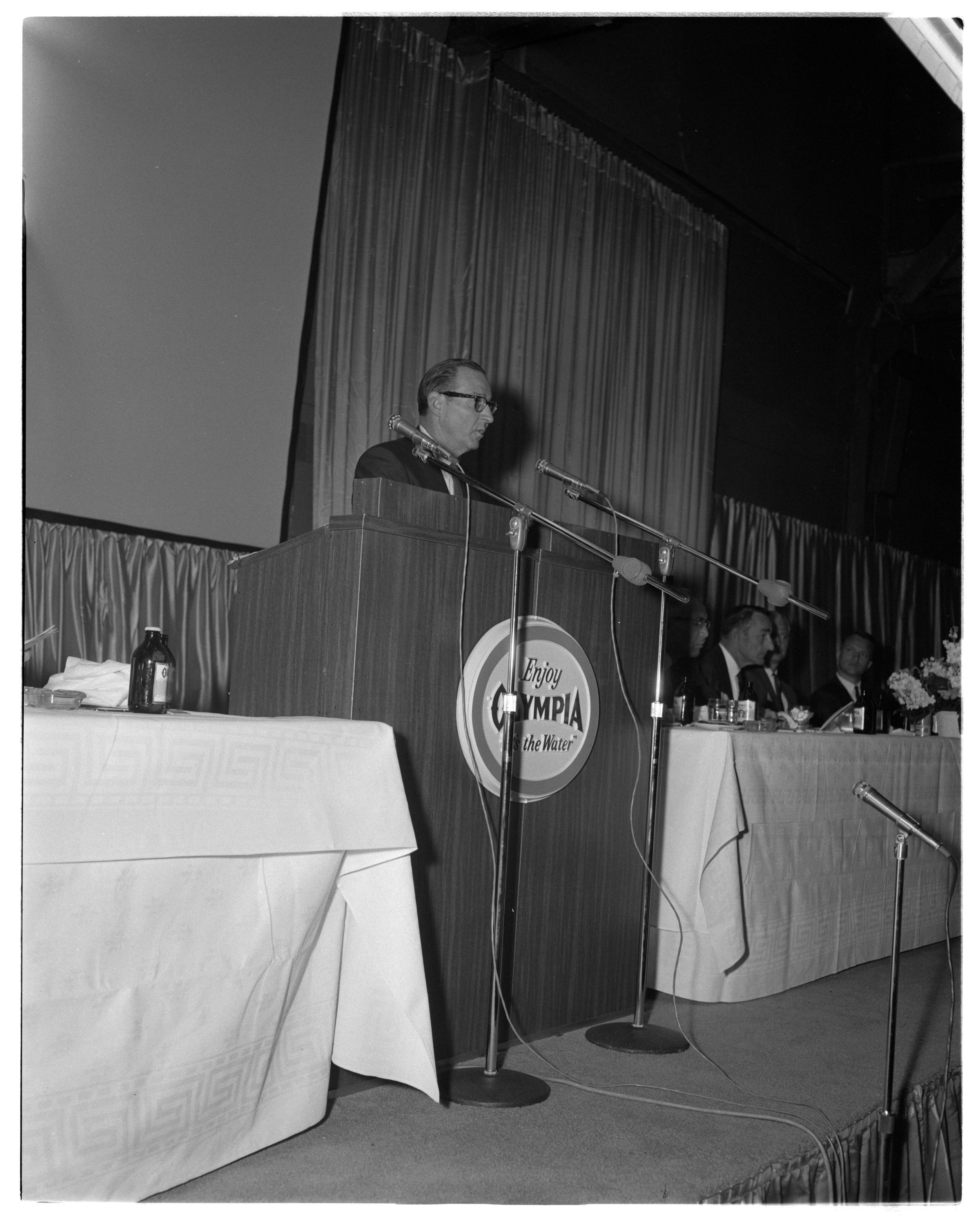 Negative, sheet film. 5 x 4 b&w. Olympia Brewing Co. stockholders meeting. Bobby Schmidt at podium. No ID on others.