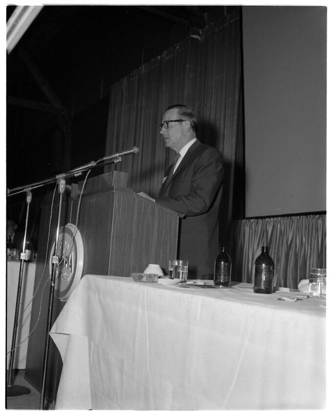 Negative, sheet film. 5 x 4 b&w. Olympia Brewing Co. stockholders meeting. Bobby Schmidt at podium.