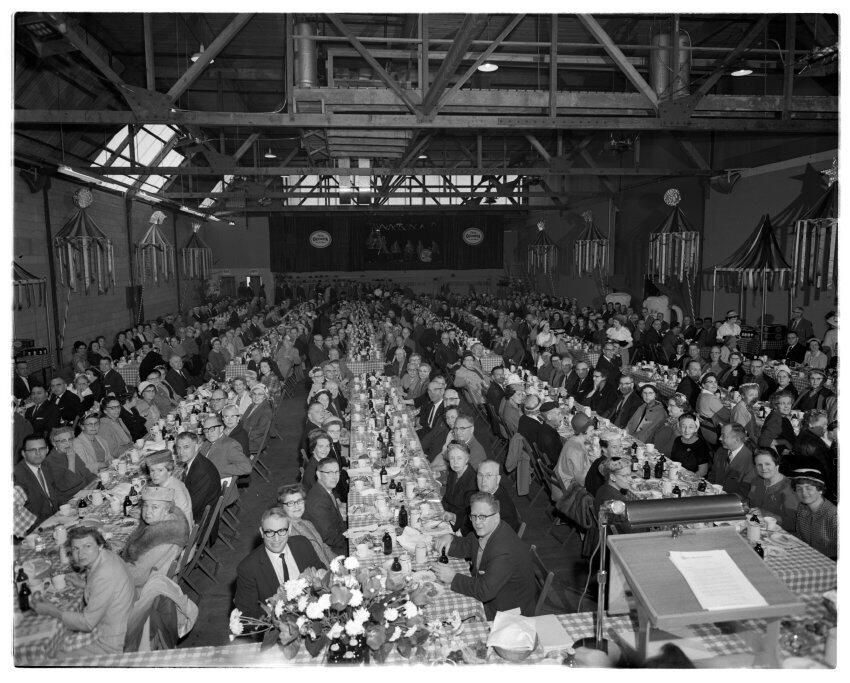 Negative, sheet film. 4 x 5 b&w. Olympia Brewing Co. stockholders luncheon. No ID on people.