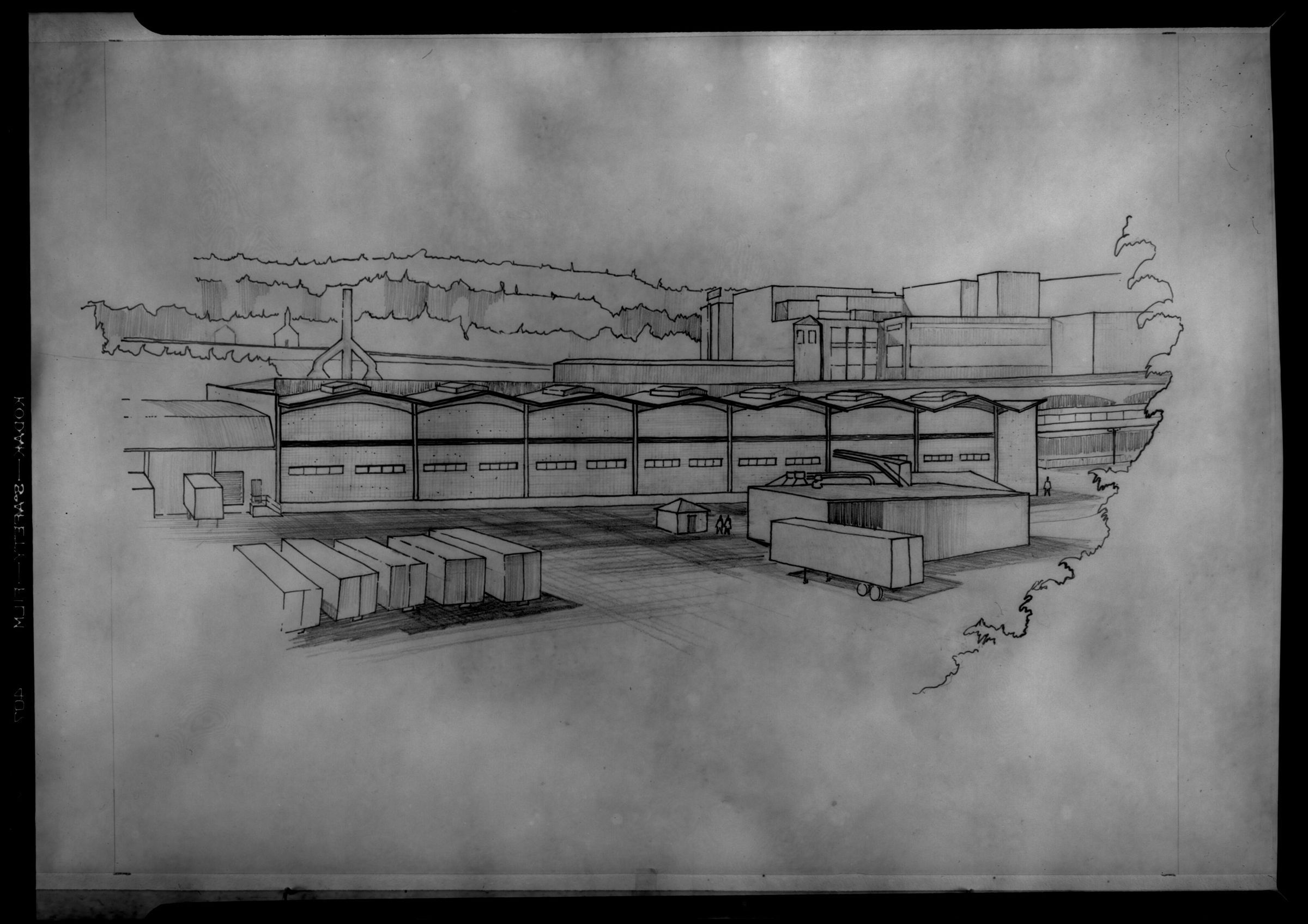 Negative, sheet film. 5 x 7 b&w. Olympia Brewing Co. Sketches by Robert Wohleb, for warehouse expansion. Copy 11/06/1964.